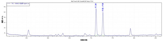 目標(biāo)物在0.1ppm-2ppm線性良好。取空白鞋材樣品加標(biāo),樣品經(jīng)過丙酮超聲萃取。1ppm加標(biāo)水平下譜圖如下,得到了比較滿意的效果。