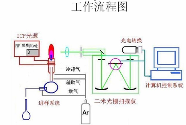 溶液進(jìn)入等離子體光源中受激發(fā),釋放出光子,形成該元素的特性譜線(xiàn),譜線(xiàn)的強(qiáng)度和蒸汽中原子的濃度成正比,進(jìn)行定量測(cè)定。