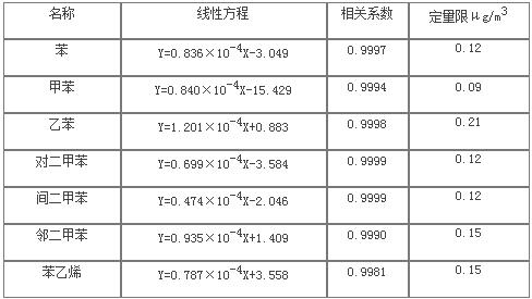 7種苯系物在進樣量1-320ng范圍內(nèi)線性相關(guān)系數(shù)為0.9981-0.9999,線性關(guān)系良好。以響應信號為基線噪聲10倍時對應的進樣濃度作為定量限,確定物質(zhì)的定量限均小于0.21μg/m3。