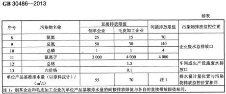 《制革及皮毛加工工業(yè)水污染物排放標(biāo)準(zhǔn)》(GB30486-2013)中明確規(guī)定了,制革及毛皮加工企業(yè)水污染物排放值、監(jiān)測和監(jiān)控要求,以及標(biāo)準(zhǔn)的實(shí)施和監(jiān)督等相關(guān)規(guī)定,其中2014年3月1日后新建企業(yè)其污水中總鉻的排放標(biāo)準(zhǔn)為1.5mg/L,六價(jià)鉻的排放標(biāo)準(zhǔn)為0.1mg/L,其排放監(jiān)控位置為車間或生產(chǎn)設(shè)施廢水排放口;2014年3月1日前已有企業(yè)其污水中總鉻的排放標(biāo)準(zhǔn)為1.5mg/L,六價(jià)鉻的排放標(biāo)準(zhǔn)為0.2mg/L,其排放監(jiān)控位置為車間或生產(chǎn)設(shè)施廢水排放口;2016年1月1日后,所有企業(yè)均按新建企業(yè)標(biāo)準(zhǔn)執(zhí)行。