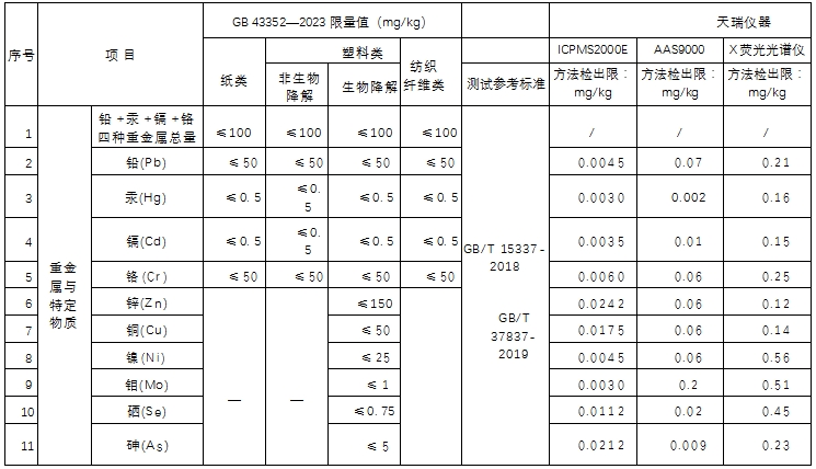 針對(duì)剛正式實(shí)施的快遞包裝首個(gè)國標(biāo),參考GB43352標(biāo)準(zhǔn),采用ICP-MS2000E測(cè)定快遞塑料包裝袋中鉛汞鎘鉻等十項(xiàng)金屬元素,各元素檢出限在0.012~0.097μg/L,加標(biāo)回收率在94.4%~102.2%之間,精密度在1.15%~6.60%之間;各元素測(cè)量值均在國標(biāo)要求的限值范圍內(nèi)。本實(shí)驗(yàn)結(jié)果表明該方法具有良好的穩(wěn)定性及精密度,完全滿足快遞塑料包裝袋中重金屬元素的測(cè)定。