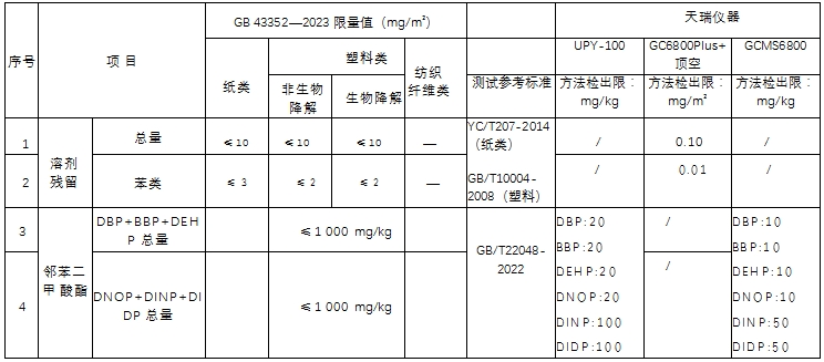 表 5. 溶劑殘留、鄰苯二甲酸酯類物質(zhì)限量及檢測(cè)一覽表