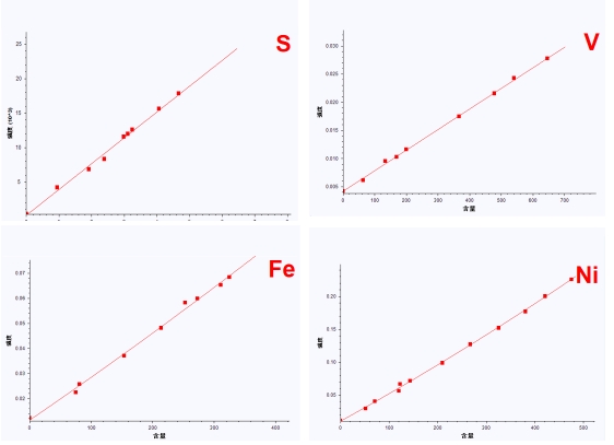 上圖為使用EDX 6000C能量色散熒光光譜儀測量不同含量石油焦二次標(biāo)樣,建立S、V、Fe、Ni元素含量與強(qiáng)度的一次或二次校正工作曲線。由圖可知,S、V、Fe、Ni組分含量與強(qiáng)度具有非常好的線性關(guān)系。