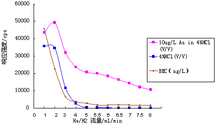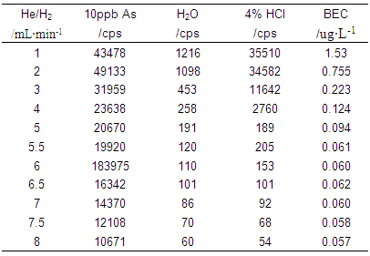 儀器首先在標準模式下進行參數優(yōu)化(利用10μg·L-1的Li、Co、In、U、Ce調諧液對儀器工作參數進行調節(jié),使儀器靈敏度高,同時氧化物及雙電荷產率小于3%);再開啟He/H2碰撞反應氣,逐步增大He/H2流量,測試超純水、4%HCl及10μg·L-1 As(4%HCl介質)在75amu處的響應信號,計算其背景等效濃度(詳細數據見表1及圖1);并利用As標液進一步優(yōu)化He/H2流量,得到儀器工作參數如表2所示。