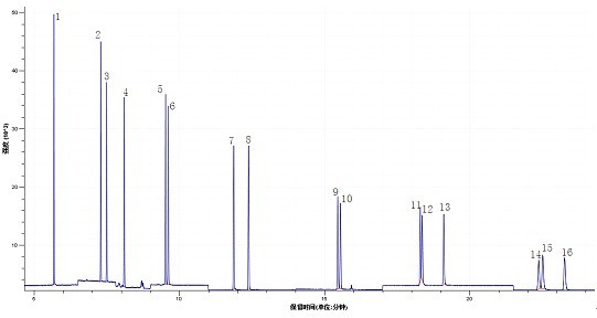 1、萘,2、苊烯,3、苊,4、芴,5、菲,6、蒽,7、熒蒽,8、芘,9、苯并[a]蒽,10、屈,11、苯并[b]熒蒽,12、苯并[k]熒蒽,13、苯并[a]芘,14、茚并[1,2,3 cd] 苝,15、二苯并[a,h]蒽,16、苯并[j,h,i] 苝