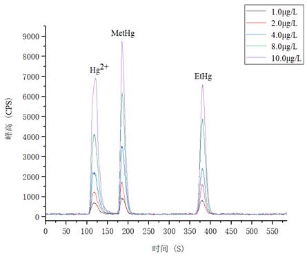 1.0μg/L、2.0.μg/L、4.0μg/L、8.0μg/L、10.0μg/L 汞形態(tài)混合標(biāo)準(zhǔn)溶液分離色圖譜如圖3所示,其中無(wú)機(jī)汞(Hg2+)、甲基汞(MetHg)、乙基汞(EtHg)相對(duì)保留時(shí)間分別為118s、185s、379s,從譜圖疊加圖上可以看出,三種汞形態(tài)出峰時(shí)間穩(wěn)定,且分離度較好。