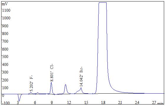 準(zhǔn)確稱取0.2g(精確至0.0001g)試樣,采用氧彈燃燒后冷卻定容,經(jīng)0.22μm的水系濾膜過濾后上機(jī)得到測試譜圖如下圖2、圖3所示。