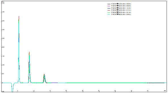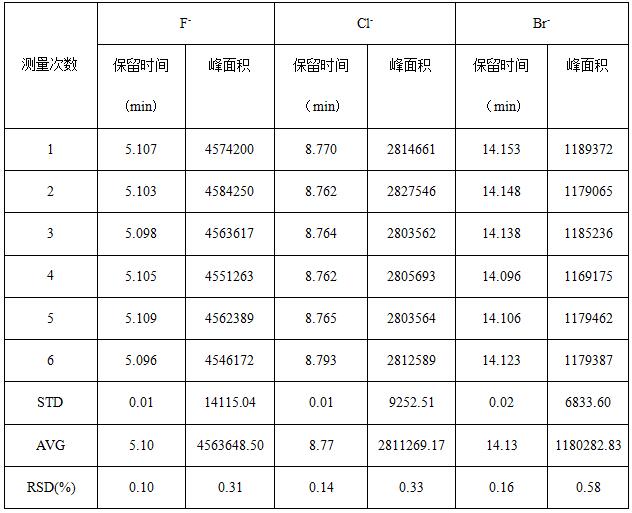 取2.0μg/mL F-、Cl-、Br-混合標(biāo)準(zhǔn)標(biāo)準(zhǔn)溶液重復(fù)進(jìn)樣6次,考察保留時(shí)間和峰面積的重復(fù)性,詳見圖4;其中保留時(shí)間(tR)相對偏差在0.10%-0.16%之間,峰面積(S)的相對標(biāo)準(zhǔn)偏差在0.38%~0.53%之間,重復(fù)性結(jié)果詳見表1。
