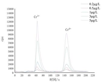 用1 mg/L Cr3+和Cr6+混合標(biāo)準(zhǔn)溶液依次稀釋配制濃度分別為0.2 μg/L、0.5 μg/L、1.0 μg/L、3 μg/L、5