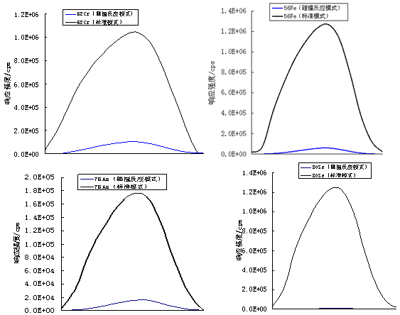 圖3.52Cr、56Fe、75As、80Se在標準模式及碰撞反應模式下響應信號(52Cr、56Fe)