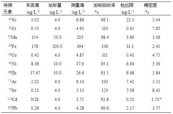 在儀器優(yōu)化工作參數條件下,對樣品溶液及加標樣液進行測試,計算其加標回收率;對樣品空白溶液平行測定7次,以三倍空白信號標準偏差/靈敏度對應的濃度為檢出限;同時對樣品溶液平行測定11次(間隔2min),計算其相對標準偏差,考察精密度,數據見表4。各元素檢出限在0.41-22.07ng/L之間,加標回收率在93.82%-123.10%之間,精密度在1.06%-8.43%之間。